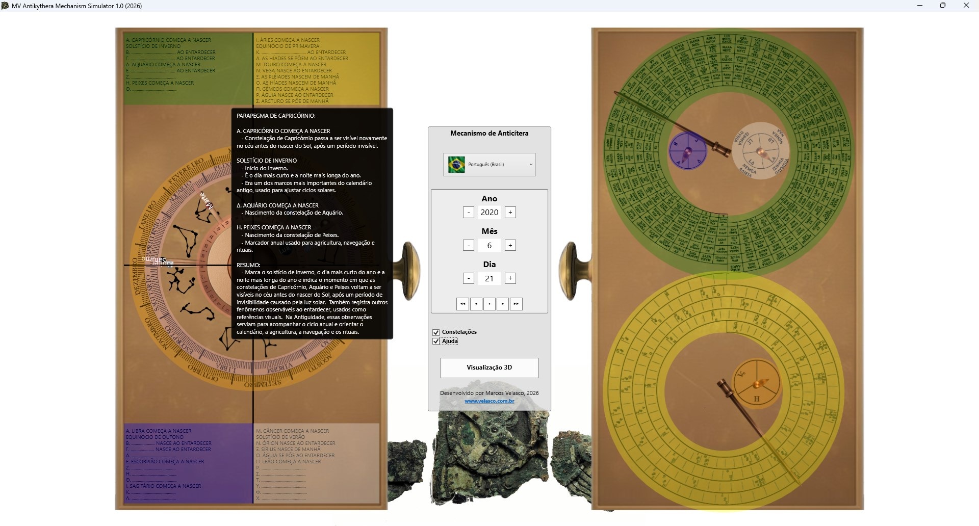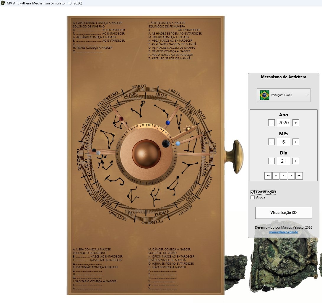 Este simulador oferece uma maneira simples e visual de compreender o funcionamento do Mecanismo de Anticítera e a relação entre seus mostradores e os fenômenos celestes reais.