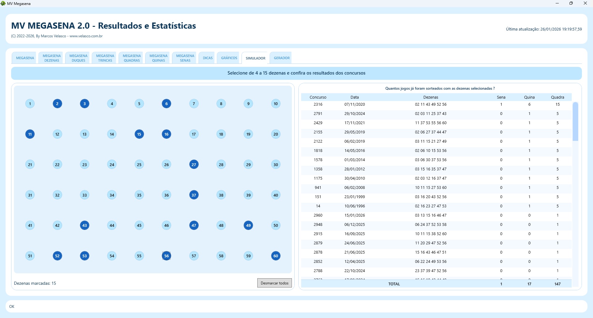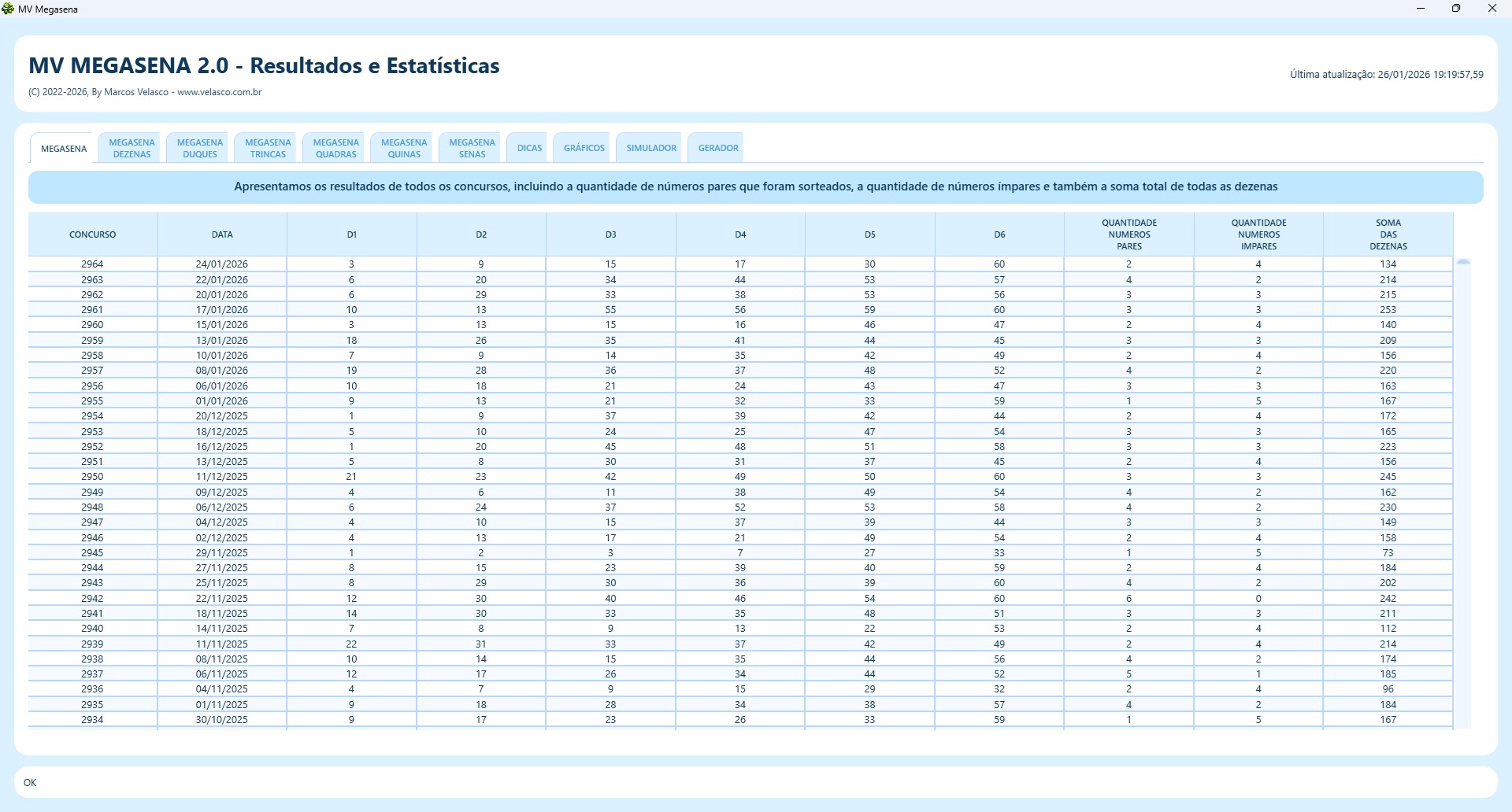 | Tabela completa dos resultados de todos os concursos |