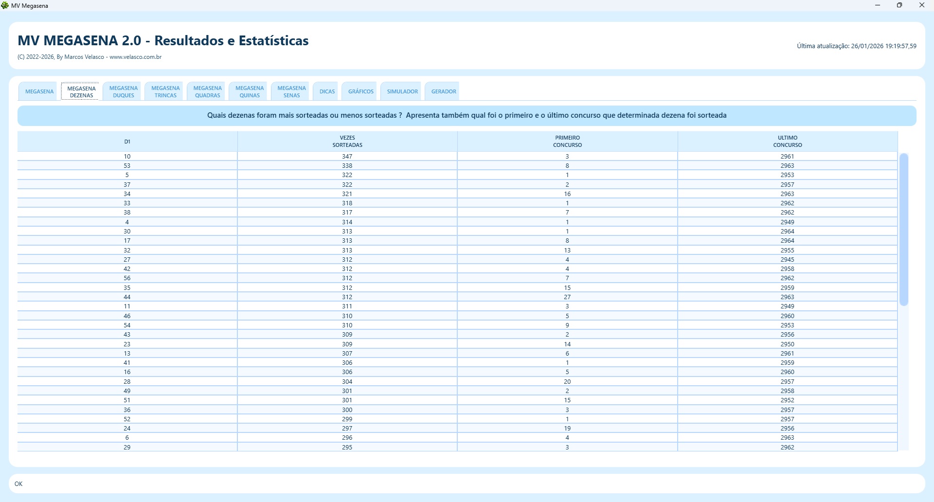 | Quais as dezenas mais sorteadas ? |