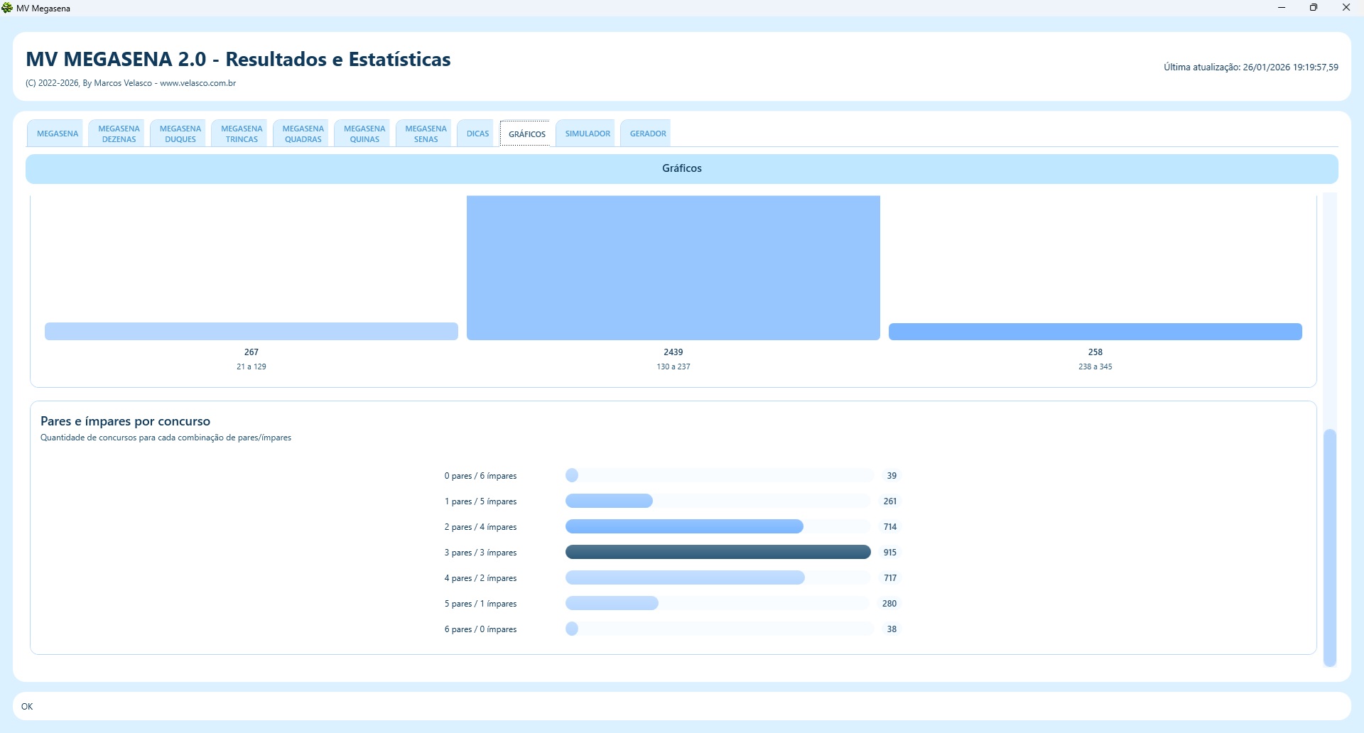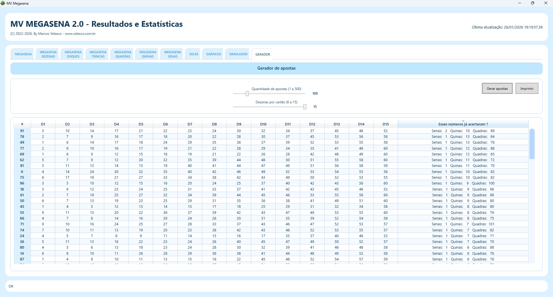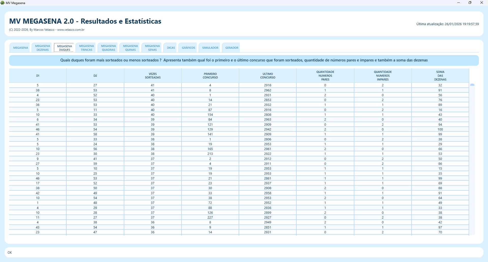 | Estatísticas de quais foram os duques, ternos, quadras e quinas mais sorterados |