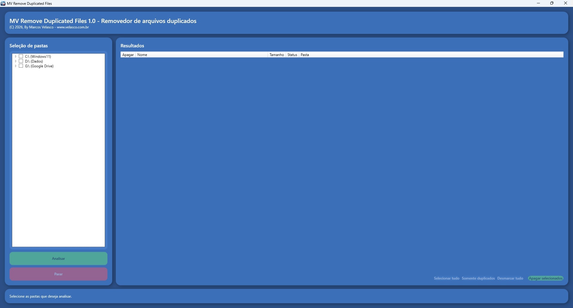 O aplicativo analisa pastas e unidades selecionadas pelo usuário, localizando arquivos repetidos com base em seu conteúdo, garantindo resultados confiáveis.