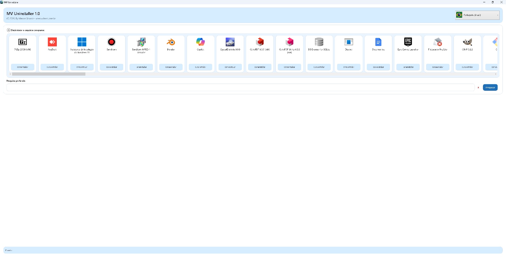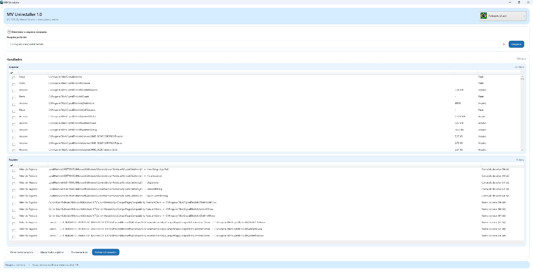 O MV Uninstaller é uma ferramenta avançada desenvolvida para ajudar na remoção completa de programas instalados no Windows, bem como na identificação e exclusão de arquivos, pastas e entradas de registro relacionadas. O objetivo do software é oferecer ao usuário um controle mais profundo sobre o sistema, permitindo a limpeza de resíduos que normalmente permanecem após desinstalações convencionais. O aplicativo realiza buscas detalhadas no sistema, incluindo arquivos, diretórios, registros do Windows e outros elementos associados aos programas instalados. Com isso, o usuário pode visualizar e selecionar itens para remoção de forma manual e criteriosa, garantindo maior eficiência na limpeza do sistema. Antes de utilizar o MV Uninstaller, é altamente recomendável que o usuário realize um backup completo dos seus dados e, se possível, crie um ponto de restauração do sistema. Essa precaução é fundamental para evitar a perda de informações importantes ou problemas no funcionamento do sistema operacional. O uso do software exige atenção e responsabilidade. Como o programa permite acesso a componentes sensíveis do sistema, a remoção incorreta de arquivos, pastas ou entradas de registro pode causar instabilidade, mau funcionamento ou até impedir a inicialização do Windows. O usuário é totalmente responsável pelas ações realizadas dentro do aplicativo. Recomenda-se revisar cuidadosamente todos os itens antes de confirmar qualquer exclusão. Recomendações de Uso: Utilize o programa apenas se tiver conhecimento básico sobre o funcionamento do sistema operacional. Sempre revise os itens encontrados antes de removê-los. Evite excluir componentes desconhecidos ou relacionados ao sistema. Realize backups regularmente para garantir a segurança dos seus dados. O MV Uninstaller foi desenvolvido para oferecer eficiência e controle avançado, mas deve ser utilizado com cautela para garantir a integridade do sistema.